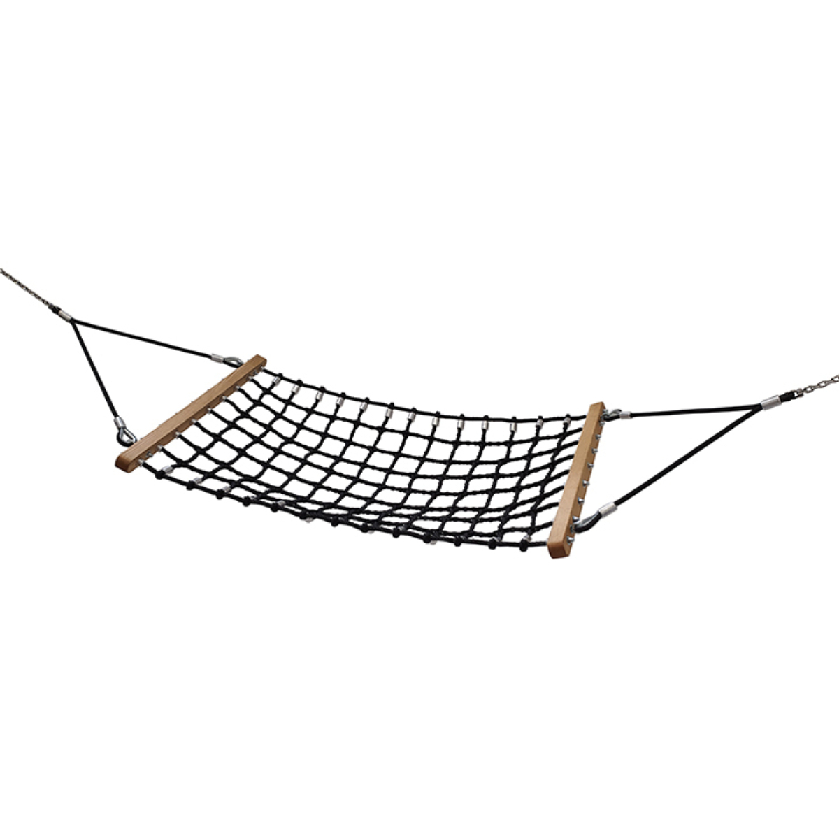 Hamacul cu frânghie cu insertie metalica "PRODUS" este o noutate în gamă și este disponibil în culoarea neagră. Fabricat din frânghie robustă Ø 16 mm, cu conectori din aluminiu și o traversă din lemn de iroko. Setul include un set de lanțuri din oțel inoxidabil. Zona de ședere extra mare creează impresia de a fi într-o barcă leagănată/hamac, ceea ce adaugă la distracție. Multe ore de relaxare garantate.